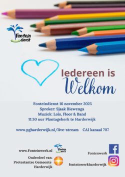 Het thema van de Fonteindienst van 16 november is “Iedereen is welkom”. In Handelingen 11: 1-18 staat het visioen beschreven wat Petrus krijgt van God. Omdat ook niet-joden Gods kinderen zijn. Ook niet-joden zijn welkom bij Hem.