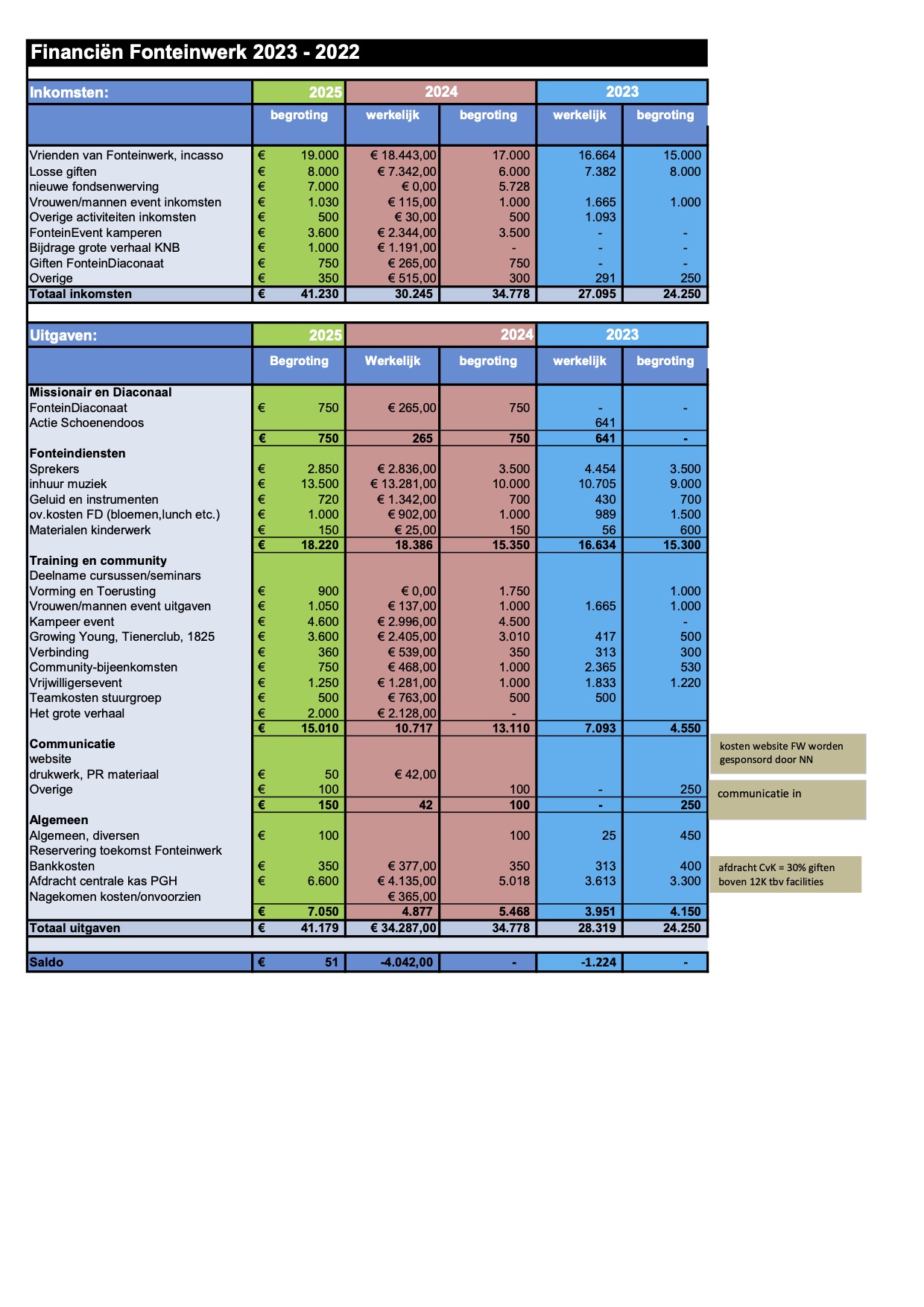 Over deze fondsenwerving zullen wij de leden van Fonteinwerk op een later moment via de mail verder op de hoogte brengen. In dat bericht zal er ook een nadere toelichting worden gegeven op de kosten die we hebben gemaakt en nog verwachten te maken in 2025.