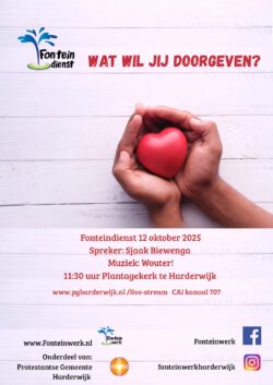 De Fonteindienst begint om 11.30 uur en is te bekijken via CAI TV kanaal 707 of via de website www.pgharderwijk.nl/live-stream (klik op de foto van de Plantagekerk).