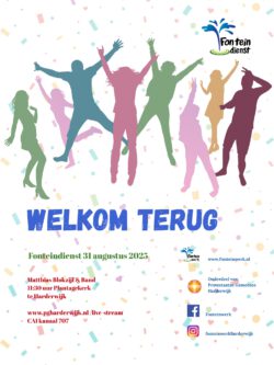 Best lang zo’n zomer hè? Als je elkaar normaal gesproken regelmatig ziet, gemiddeld zo’n 3 keer per maand, dan is het vreemd om elkaar 7 weken niet te zien. Maar gelukkig komt daar zondag 31 augustus verandering in. Om 11.30 uur organiseren we een Fonteinviering, met de titel “Welkom terug!”.