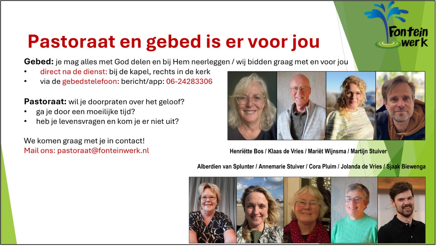 Lees hier meer over Pastoraat en gebed, of neem direct contact op via pastoraat@fonteinwerk.nl .