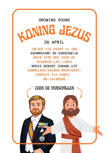 Zondag 26 april, de dag voor koningsdag is er weer een Growing Young meeting. We gaan het hebben over Koning Jezus. Wie is koning Jezus en wat zijn de verschillen met koning Willem Alexander? Met wat drinken en een korte inleiding van Sjaak Biewenga gaan we met elkaar op zoek naar vragen en antwoorden.